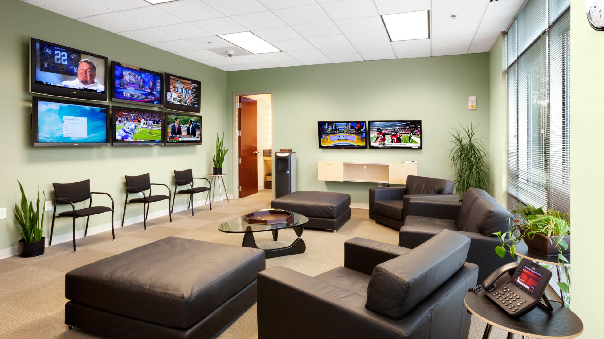 Tasked with the infrastructure upgrades, Lawson also brought style and personality to the clean, functional ESPN aesthetic. Glass walls provide both privacy and transparency while furniture and finishes add interest and comfort. To accommodate large events and team functions, the serving counters in the pantry area can be conveniently moved to other areas within the redesigned space.